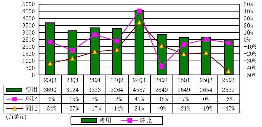 成本与费用方面,公司第三季度成本为1200万美元,同比增长14.4%;毛利为2330万美元,同比增长10.8%,毛利率维持在66%的水平。运营费用总额为2530万美元,较上年同期的4590万美元大幅下降44.8%。其中,研发费用减少52.8%至1380万美元,主要因全球员工队伍优化导致人员成本下降,股权激励支出从1080万美元降至70万美元。销售及市场营销费用下降5.6%至650万美元,一般及行政费用下降48.4%至500万美元。