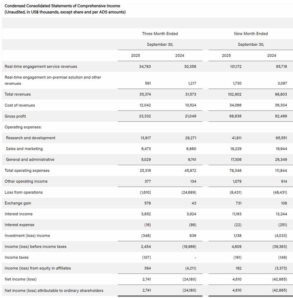 在盈利方面,Agora, Inc在2025年第三季度实现净利润274万美元(约2000万元),净利润率为7.8%。这是公司继2024年第四季度扭亏为盈后,连续第四个季度在美国通用会计准则(GAAP)下实现盈利。公司前三季度累计营收达1.03亿美元,净利润为461万美元。