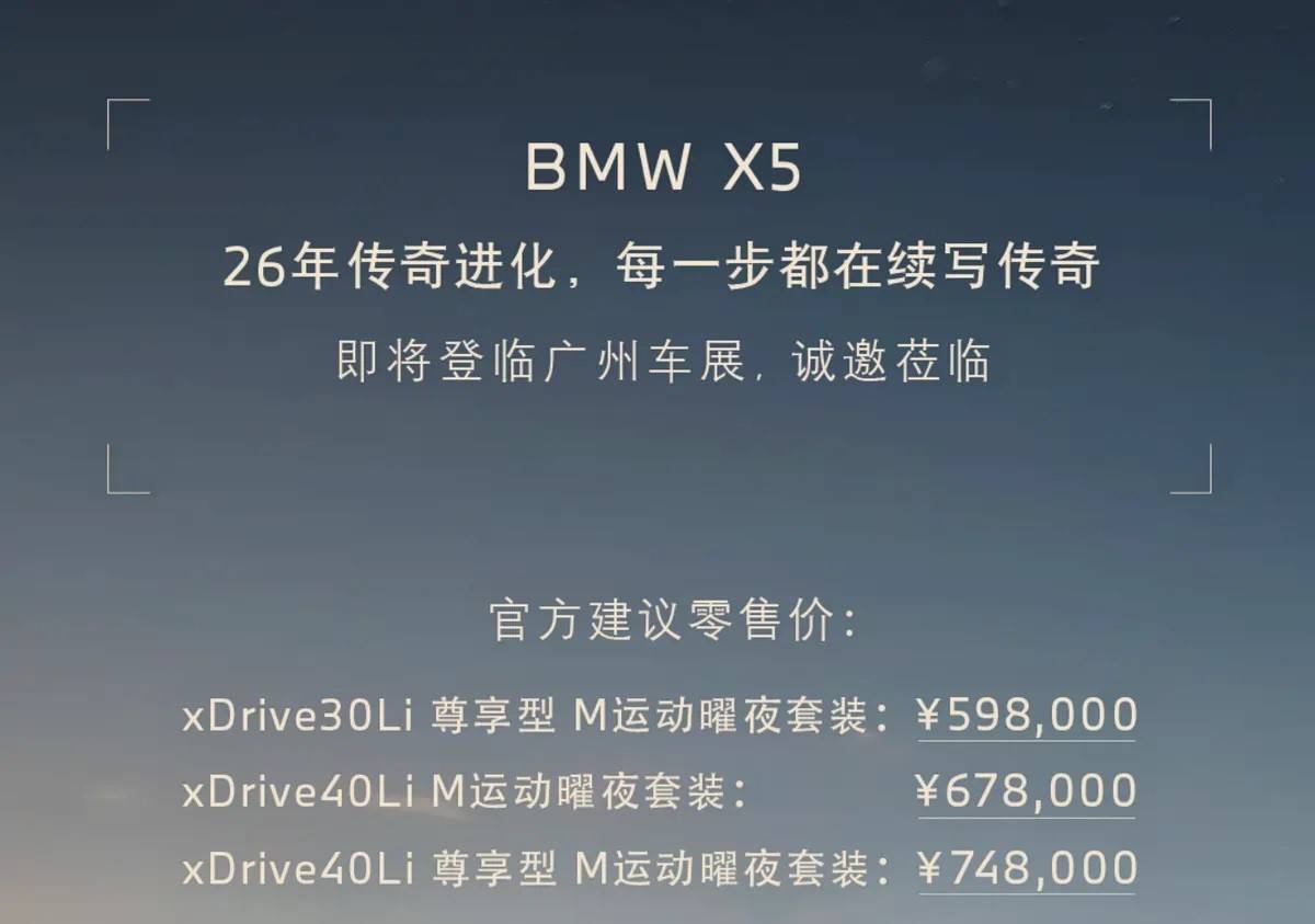 宝马官方近日宣布,旗下中大型SUV宝马X5迎来重要改款升级,此次共推出三款不同配置车型,为消费者带来更多选择。三款车型分别为xDrive30Li尊享型M运动曜夜套装、xDrive40Li M运动曜夜套装以及xDrive40Li尊享型M运动曜夜套装,售价依次为59.8万元、67.8万元和74.8万元,在价格调整的同时,配置方面也有显著提升。