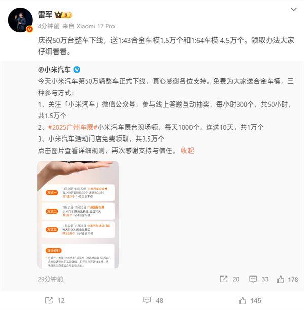 为回馈用户支持,雷军宣布推出大规模庆祝活动,将免费赠送6万份合金车模,其中包含1.5万个1:43比例车模和4.5万个1:64比例车模。此次赠礼活动通过三种渠道同步开展,覆盖线上线下多场景参与方式。