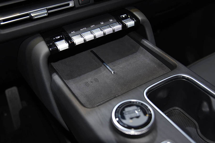 进入车内,iCAR V27的内饰设计在延续家族风格的基础上,于细节处进行了创新。车辆配备了悬浮式中控屏,下方依次排列着空调出风口和一排物理按键,这种设计既体现了科技感,又保留了越野车型应有的实用属性。中央扶手区域布局合理,设有无线充电面板、驾驶模式旋钮以及水杯架等,方便驾驶者在行车过程中操作。后排采用三座布局,并配备了空调出风口,为后排乘客提供了舒适的乘坐体验。