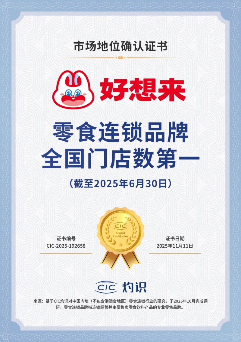 近日,专业咨询公司CIC灼识咨询颁发市场地位确认证书,称经对中国内地(不包含港澳台地区)零食连锁行业的研究,截至2025年6月30日,万辰集团旗下量贩零食品牌好想来全国门店数量位列零食连锁品牌第一。