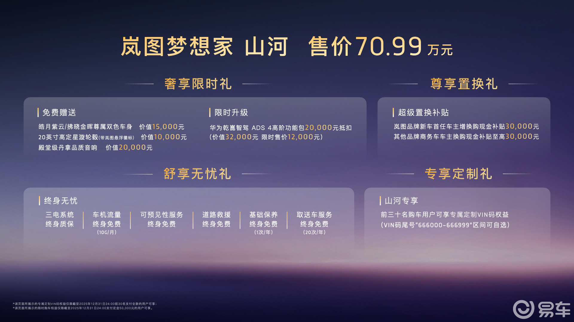 在广州车展的聚光灯下,一款以“山河”为名的四座旗舰MPV——岚图梦想家山河正式登场,售价70.99万元。这款专为新时代行业领军者、企业家及高净值精英打造的座驾,不仅承载着“阅遍山河、开创山河”的壮志,更以安全智能、舒适私享与中式美学的深度融合,重新定义了高端MPV的价值标杆。