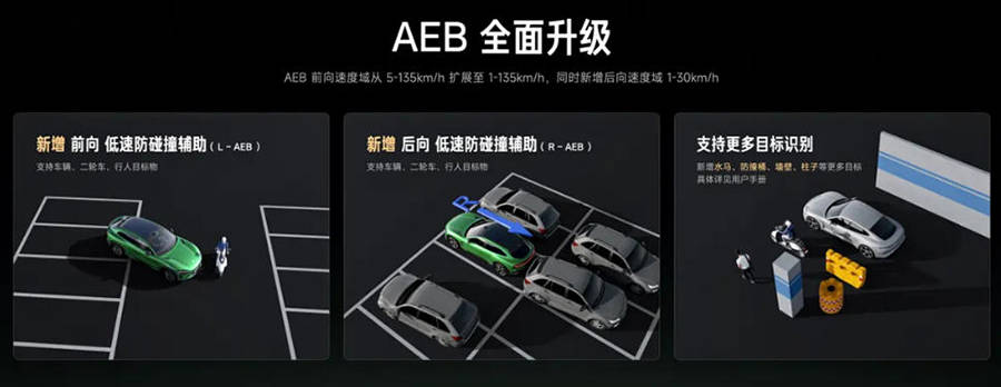 核心升级围绕AEB防碰撞系统展开,新增前向低速防碰撞辅助(LAEB)与后向低速防碰撞辅助(RAEB)。在1-10km/h前向行驶或1-30km/h倒车场景下,系统可实时监测行人、车辆及二轮车等动态目标,当检测到碰撞风险且驾驶员未及时响应时,将自动触发预警并实施制动。此次更新使AEB工作速度域从原有的5-135km/h扩展至前向1-135km/h、后向1-30km/h,同时新增对墙壁、立柱等静态障碍物的识别能力,显著提升复杂环境下的防护效能。
