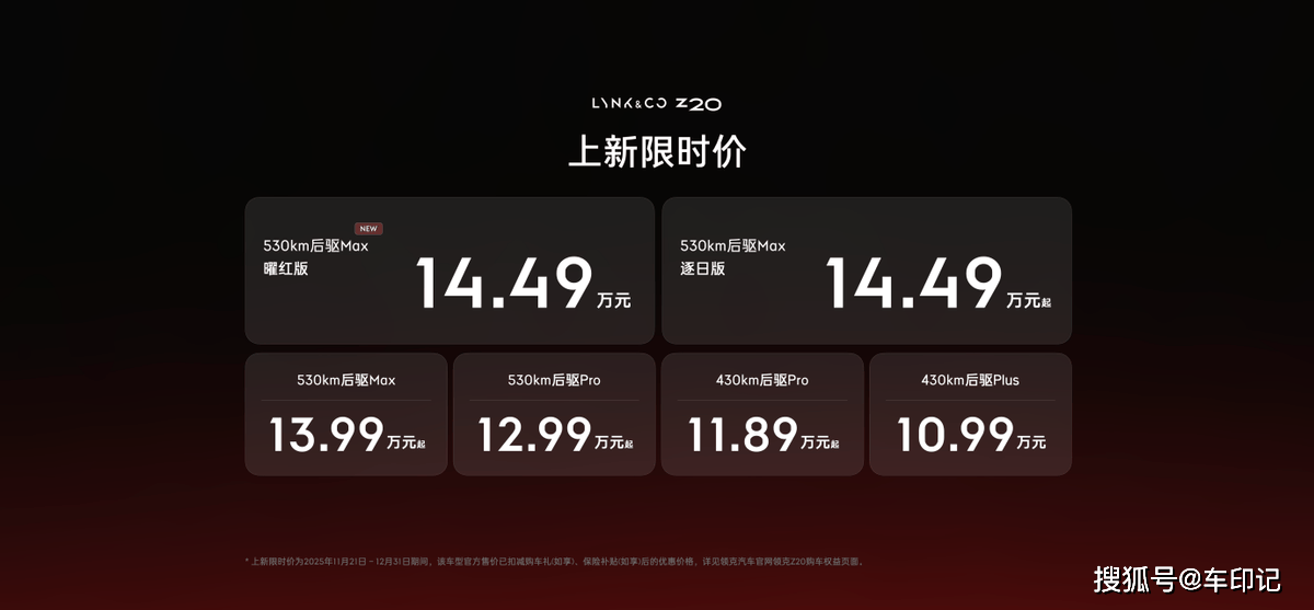 在广州车展的聚光灯下,一款名为“智趣驾享纯电SUV”的领克Z20 530km后驱Max曜红版正式亮相,以14.49万元的上新限时价,为A级纯电SUV市场注入了一股新鲜活力。这款车不仅以独特的“曜红”内饰吸引眼球,更在多个维度展现了其全能实力,成为都市精致出行的新选择。