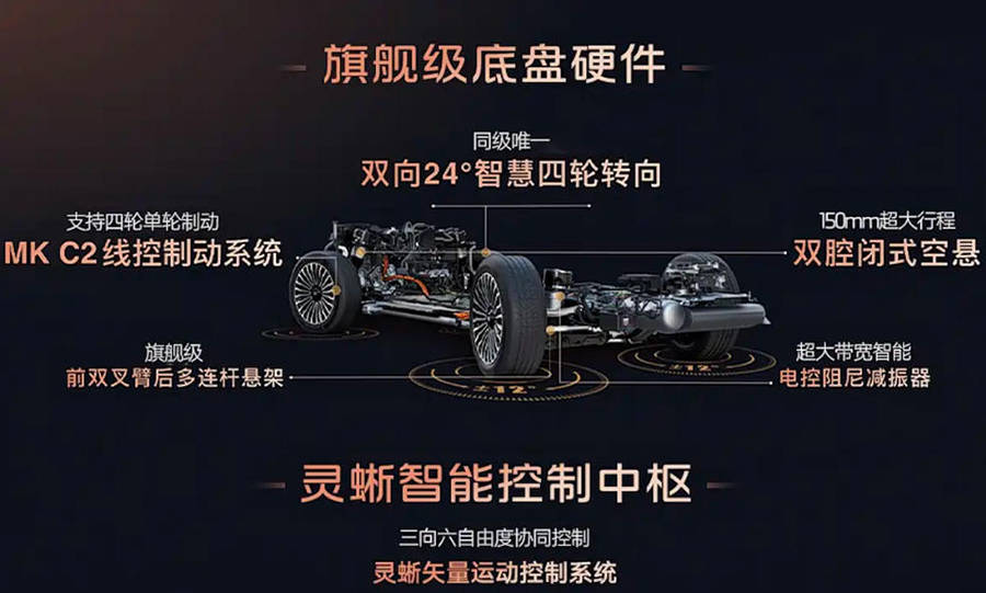 底盘方面,智己LS9搭载的灵蜥数字底盘3.0表现出色。提供双向24°超大角度智慧四轮转向系统,配备四轮单轮制动MK C2线控制动系统。支持150mm智能双腔闭式空悬,配以智能电控阻尼调节系统,前双叉臂后多连杆悬架的组合,让车辆行驶更加稳定舒适。全系标配灵蜥矢量四驱系统,并支持灵蜥爆胎稳定控制系统与主动防侧翻3.0系统,为行车安全保驾护航。