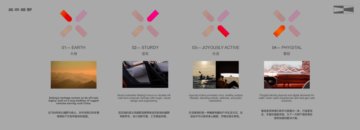 与此同时,北京越野还发布了全新的设计理念——“ELEMENTAL”(元素化)。这一理念建立在四大核心支柱之上:大地Earth、坚实Sturdy、乐活Joyously Active与智控Phygital。它不仅契合了北京越野的品牌特质,更贴合了客户对于探险、健康与户外生活的核心关注。从这一刻起,北京越野将这一理念创造性地、持续地应用于全系车型,为越野爱好者带来更加丰富多样的选择。