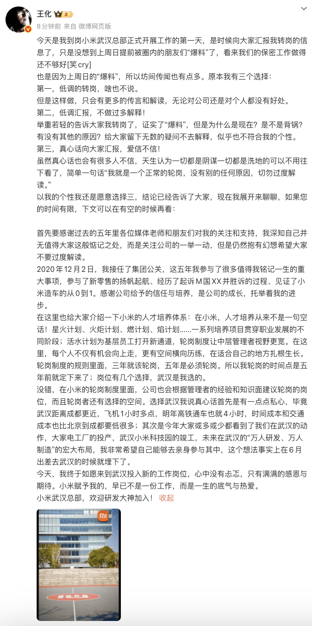 王化在社交平台公开透露,此次调任是遵循小米内部轮岗制度的结果。根据公司规定,中层管理者每五年必须轮岗,而武汉是他主动选择的岗位。他坦言,选择武汉既有个人因素——该地距离成都更近,交通便利性显著提升;也出于职业考量——小米在武汉正推进"万人研发、万人制造"的重大布局,包括大家电工厂投产和科技园竣工等项目,他希望亲身参与这一战略进程。