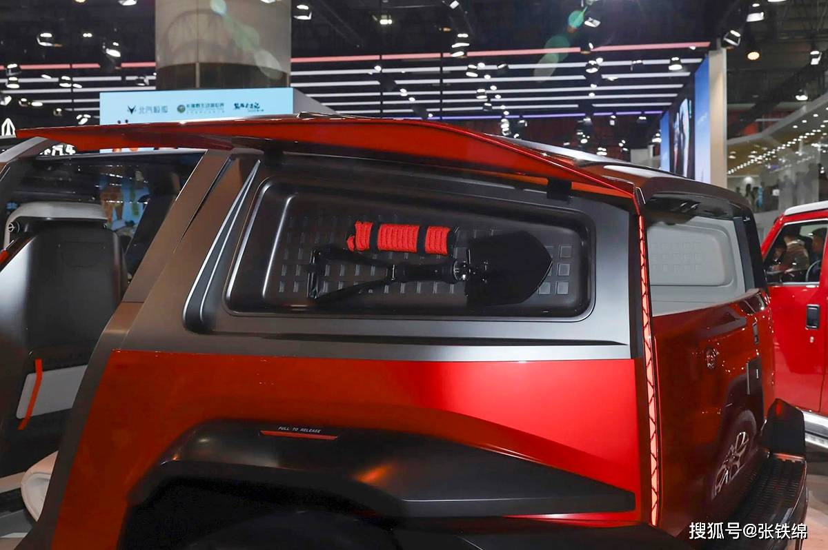 转到车尾,方正垂直的造型给人一种稳重的感觉。后风挡采用了可升降式设计,竖条形的尾灯十分抢眼,在夜晚点亮时辨识度极高。后杠造型与前杠相呼应,同样粗犷硬朗,展现出越野车的独特魅力。