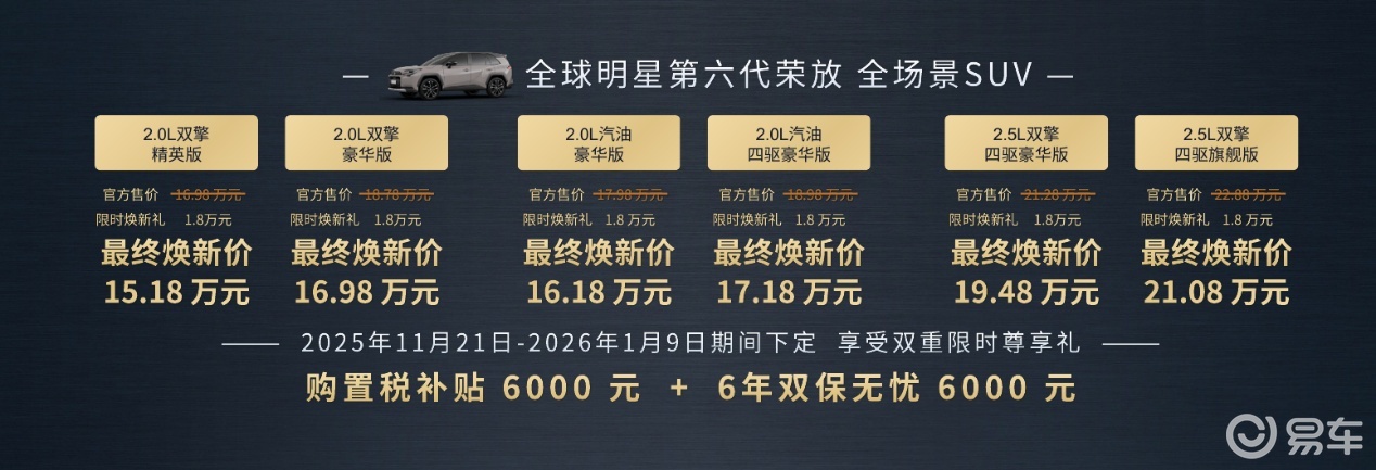 一汽丰田此次在价格策略上诚意满满。官方宣称,全新荣放在外观设计、智能座舱、动力总成、智驾辅助以及安全配置等多个方面进行了全面升级,整体升级幅度折算约1.5万元。然而,部分车型的定价却不升反降。以全新荣放2.0L双擎豪华版为例,相较于上一代风尚PLUS 2.0汽油版(售价19.98万元),其产品力显著提升,但官方指导价仅为18.78万元,账面综合价值提升接近2.7万元。若在“限时尊享下定期”期间,还可享受最高1.8万元现金权益,实际到手价最低可至16.98万元。后续还能再享6000元购置税补贴以及价值6000元的售后服务礼包,进一步降低了混动SUV的准入门槛。