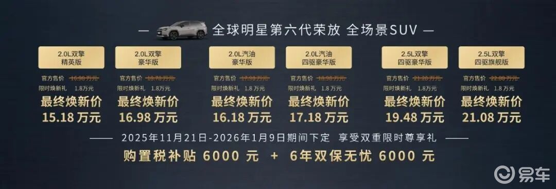 在第二十三届广州国际车展的璀璨舞台上,一汽丰田携第六代RAV4荣放惊艳亮相并正式上市。这款备受瞩目的新车,以全球化设计理念为蓝本,深度融合中国市场的独特需求,推出了涵盖两驱与四驱布局的6款配置车型,官方指导价区间为16.98 - 22.88万元,为紧凑型SUV市场注入了新的活力。