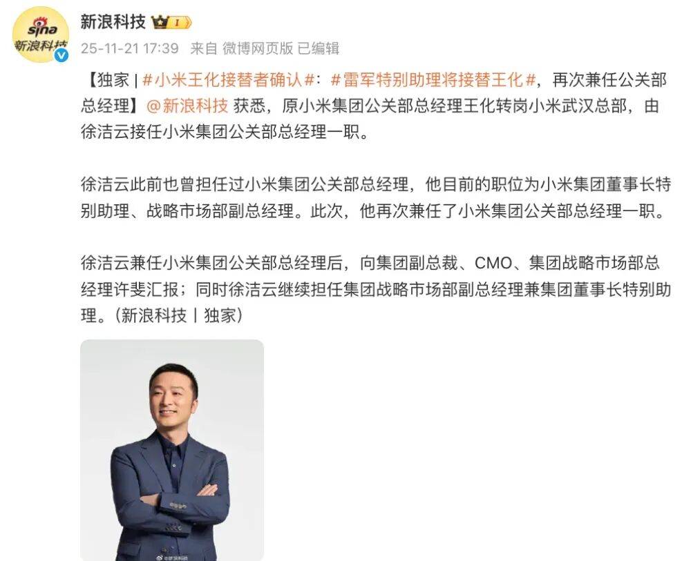 小米集团近日完成了一次重要的人事调整。原公关部总经理王化已正式转岗至小米武汉总部,其职位由徐洁云接任。这一变动引发了外界的广泛关注,王化本人也在社交平台公开回应了相关传闻。