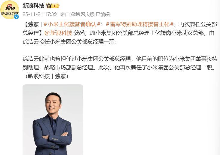 据媒体披露,小米集团近日完成了一次重要的人事调整。原集团公关部负责人王化已调任武汉总部,其职位由徐洁云接任。徐洁云此前曾担任过该职务,目前还兼任集团战略市场部副总经理及董事长特别助理。