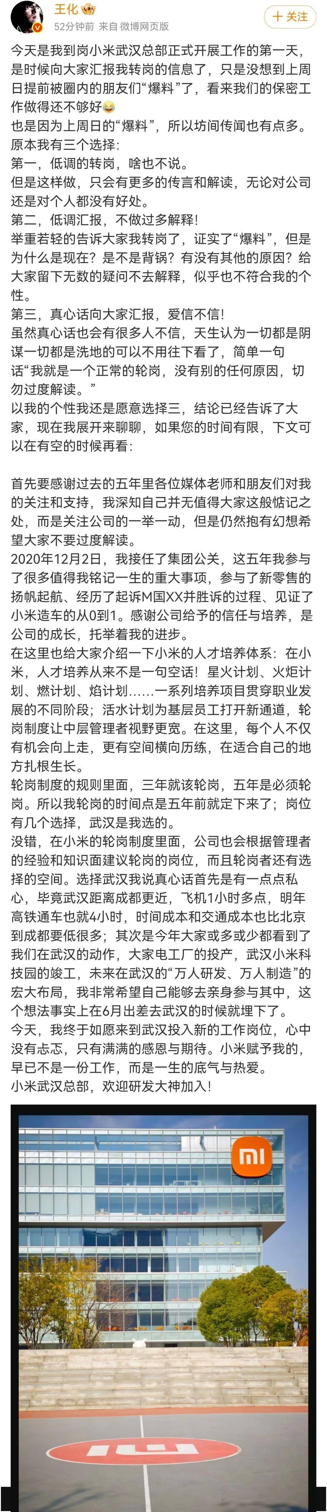 王化在社交平台公开回应称,此次调动属于正常轮岗安排,与近期舆论事件无关。他透露,选择武汉总部部分出于个人考量——该地与家乡成都距离较近,可降低通勤成本。同时他提到,小米在武汉的布局正逐步深化,包括新建科技园区和投产家电工厂,未来将形成"万人级"研发制造基地。根据集团制度,管理人员每五年需进行岗位轮换,此次调动实际是五年前制定的计划。