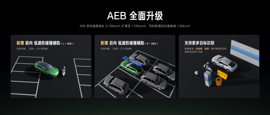此次更新还引入了紧急转向辅助(AES)功能,进一步拓展了极端场景下的避险能力。当车速处于80-135km/h区间且前方突发障碍物时,系统会优先尝试通过AEB制动避险。若判断全力制动仍无法避免严重碰撞,且周边具备充足避让空间,AES将启动横向转向辅助,帮助车辆规避风险。该功能覆盖行人、车辆、二轮车等常规目标,同时对逆向车辆、横向入侵物体及摔倒的二轮车等高危场景也具备主动避让能力。