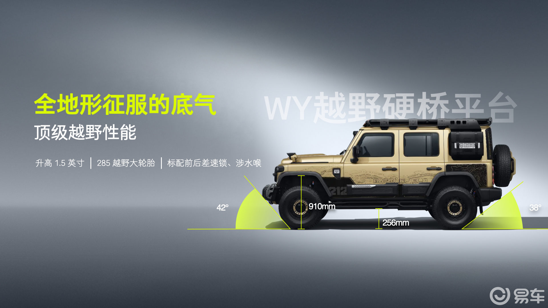 作为本次车展的重磅新品,212 T01高地定位为“全副武装的性能战士”,专为长途穿越、户外越野和自驾旅行等多元化场景打造。该车型传承了家族标志性的“一拱、二圆、三横”设计元素,前罩进气格栅如山峦般隆起,与“高地”理念相呼应。车身尺寸整体扩大,硬派风格更加突出。专属定制色“晨曦金”搭配“高地纹”灵感的门饰板与车身贴,增加了防滑侧踏板、瞄准镜式门把手等实用配置,每一处设计都兼顾了功能性与视觉张力。