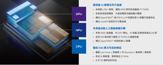这颗 SoC,就是酷睿 Ultra 处理器。它在单一封装内集成了 CPU、英特尔锐炫™ GPU 和 NPU,并让三者协同工作,AI推理能力、高性能CPU计算与工业级实时控制,“一手”拿捏。