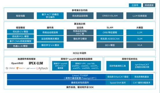 从“机器人看什么、怎么学、怎么动”,一直到系统层面的调度、驱动、实时控制,英特尔提供了全栈套件,开发者不用“零帧”起步。