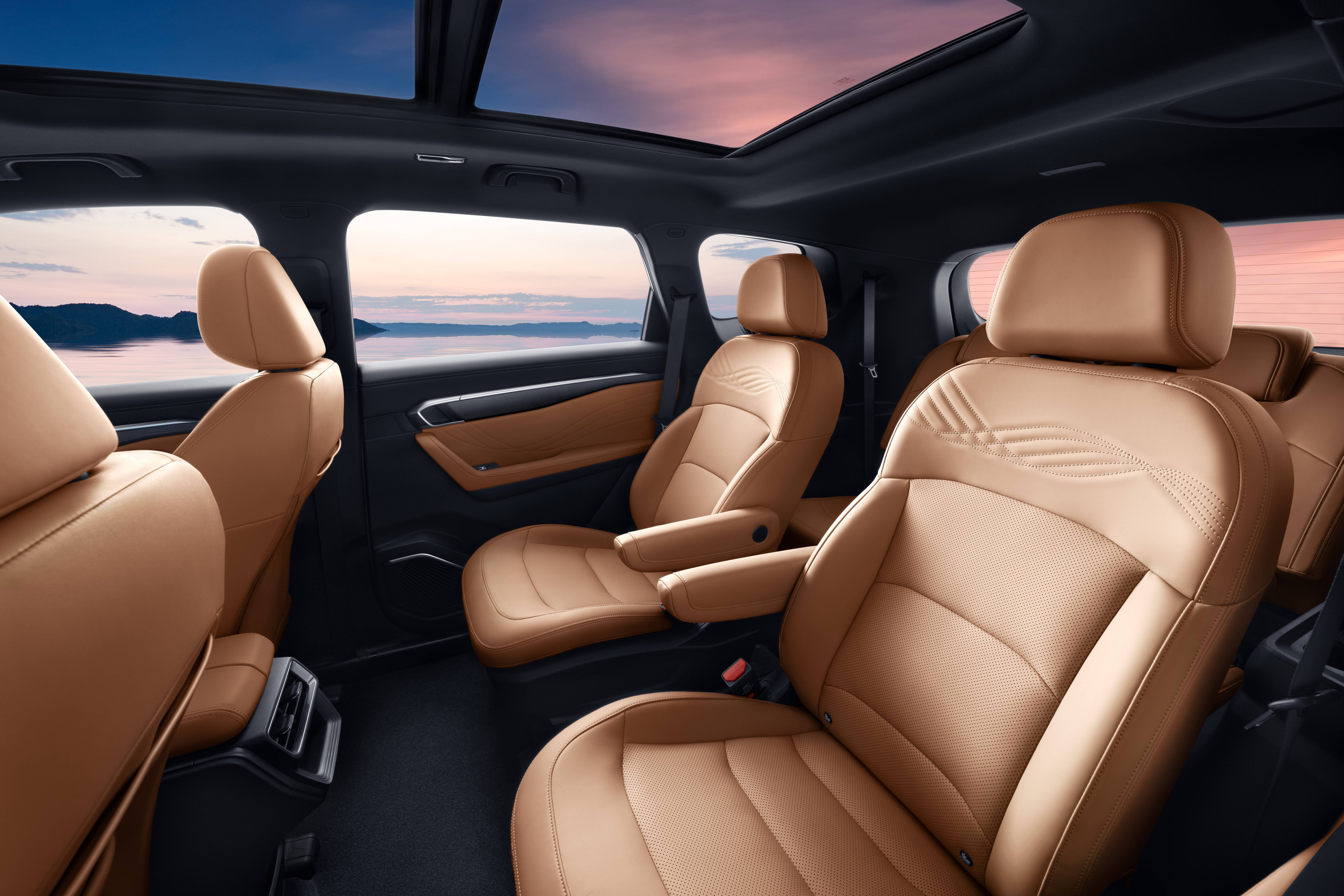 在空间布局上,新款豪越L提供了5座、6座、7座三种座椅布局方式。其中,5座版本车型凭借1910mm的车宽,不仅拥有628L的超大行李箱空间,还巧妙设计了96L的隐藏式暗格以及46L的随车工具专属空间。6座版本则采用了2+2+2的座椅布局,中央通道宽度达到了179mm,第二排座椅不仅美观且舒适,配备了四向电动调节、8点气动按摩以及3档通风与加热等舒享功能。7座版本则采用了2+3+2的全独立座椅布局,第三排乘坐空间宽敞,靠背可实现8档16°调节,同时全车还拥有49处储物空间以及32种空间组合方式,二、三排全平放倒后可拓展为2360升储物空间或2.2米大床模式,满足露营、长途等多种出行场景的需求。