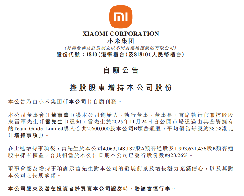 小米集团近期在资本市场动作频频,引发市场广泛关注。公司创始人、董事长兼CEO雷军以个人名义斥资超1亿港元增持260万股,持股比例由此提升至23.26%。这一举动被视为管理层对公司长期价值的坚定信心。