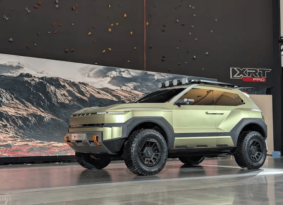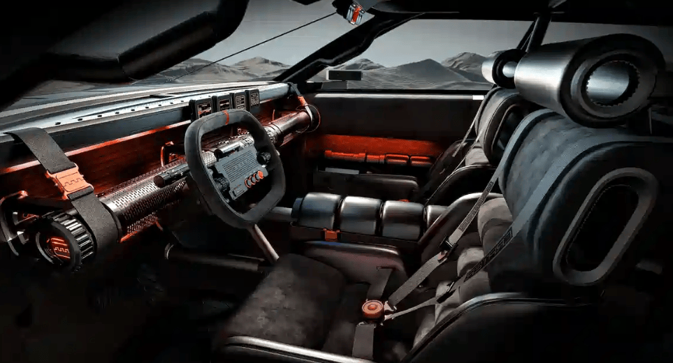 内饰设计是Crater概念车最受瞩目的核心亮点。座椅采用轻量化一体成型工艺,头枕与安全带锚点实现无缝衔接,前后排均配备四点式安全带系统,营造出强烈的赛车化驾驶氛围。对开门结构搭配B柱外露的防滚架,既强化了越野场景下的安全防护,又通过金属框架的裸露设计,将机械结构的美学张力直接呈现于视觉中心。值得一提的是,车内部分组件采用回收环保材料打造,在硬核风格中融入可持续理念,形成独特的材质对比。