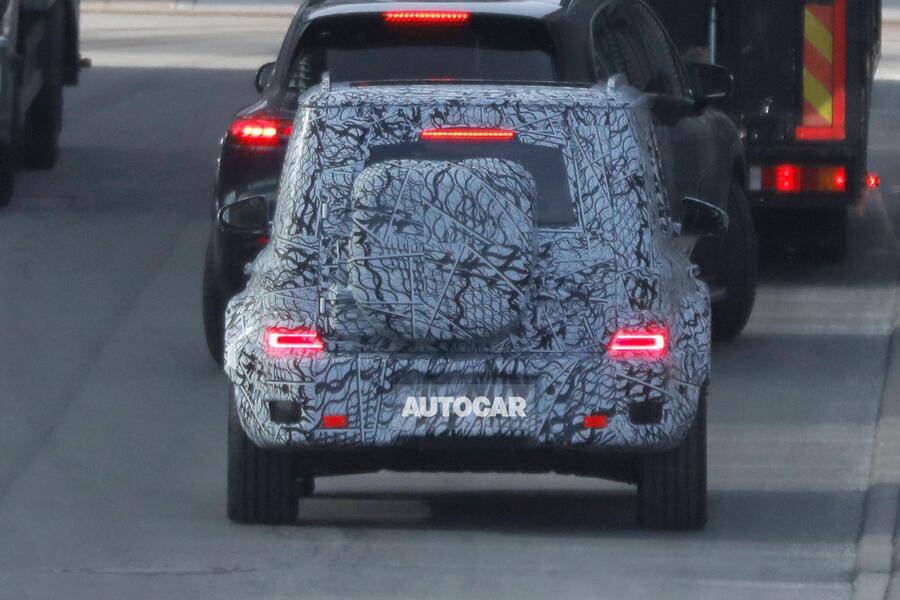 从已曝光的伪装路试车来看,“小G”延续了G级标志性的方正轮廓,三片式侧窗与外挂式备胎等经典元素得以保留,但大灯组采用了全新设计,整体造型更显精致。车身尺寸方面,新车高度明显低于现款车型——与高1718mm的EQS SUV并排时,其车顶高度更低,而标准版G级的车高为1969mm,凸显出“小G”的紧凑定位。