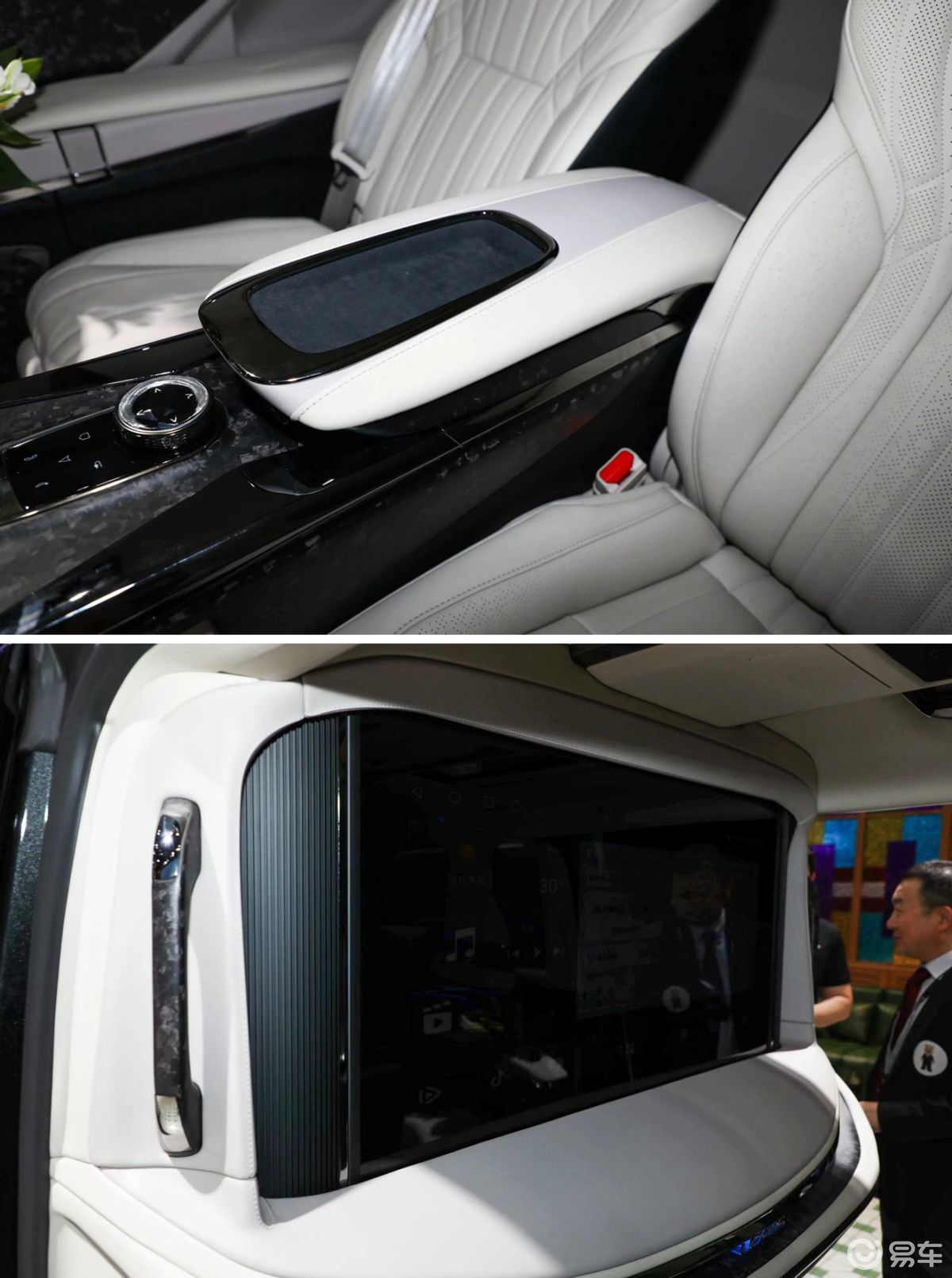 此次展出的2座版本车型,通过取消第三排座椅并优化第二排空间,将腿部伸展空间拓展至1080mm。独立行政座椅配备零重力模式与热石按摩功能,座椅倾角调节范围达170°,配合可升降腿托与航空头枕,构建出陆地头等舱的乘坐体验。车顶全景天幕采用电致变色玻璃,可在0.1秒内完成透光率调节,有效过滤99%紫外线。