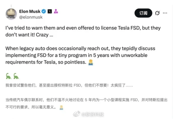 特斯拉首席执行官马斯克近日在社交平台透露,公司曾多次尝试向传统汽车制造商开放其全自动驾驶(FSD)技术授权,但均未获得积极回应。他直言,部分车企在接触过程中提出的合作条件"脱离现实",甚至将短期技术验证项目与长期战略规划混为一谈。