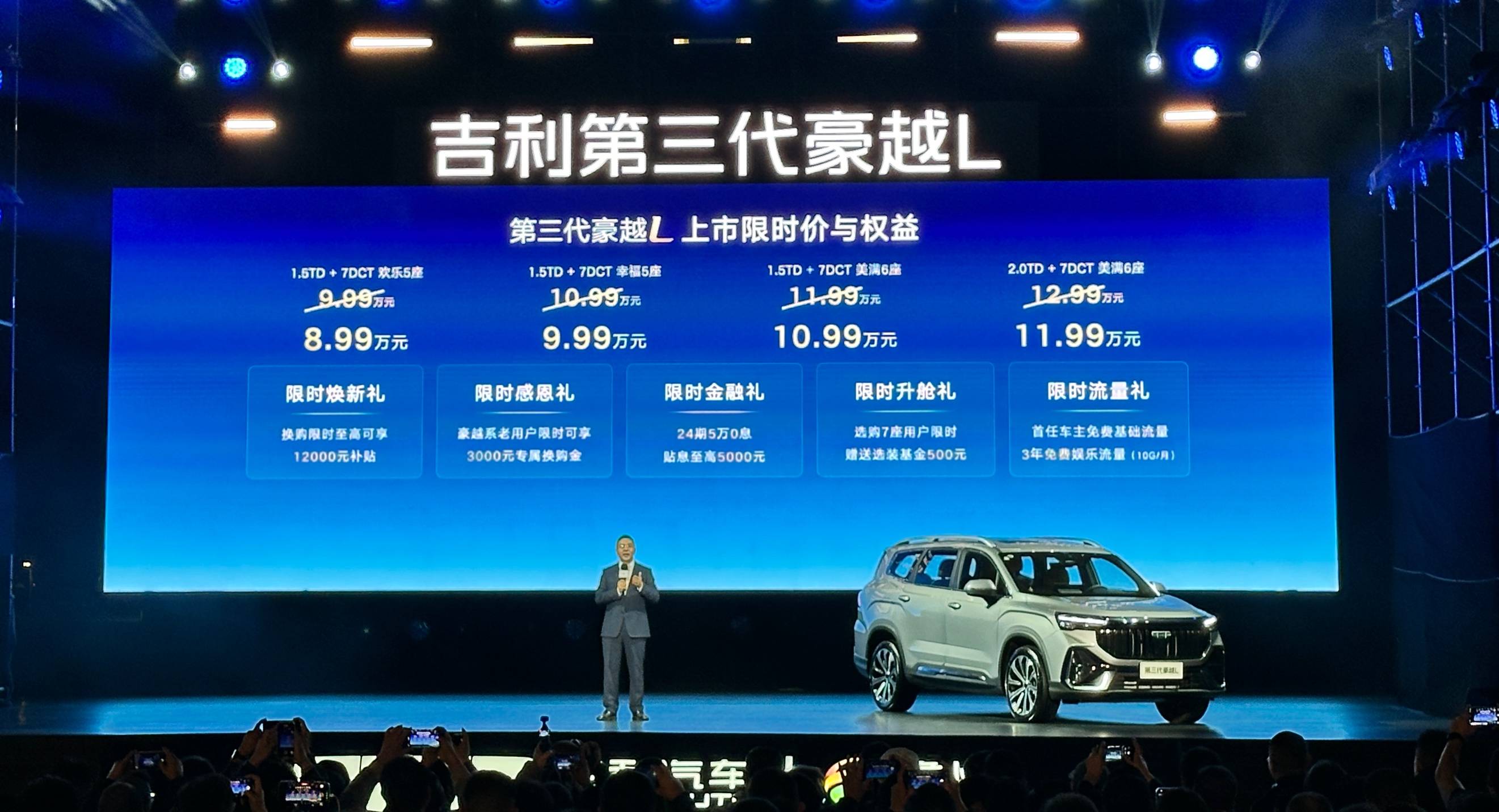 吉利中国星家族唯一B级燃油SUV——第三代豪越L正式登陆市场,共推出4款配置车型,官方指导价区间为9.99万至12.99万元。即日起至12月31日,消费者下订可享1000元订金抵扣11000元购车款的限时优惠,实际购车价下探至8.99万至11.99万元。厂家同步推出多重购车权益,包括至高12000元换购补贴、豪越系老用户专属3000元换购金、24期5万0息金融方案(贴息至高5000元)、7座车型500元选装基金,以及首任车主基础流量终身免费与3年每月10G娱乐流量。