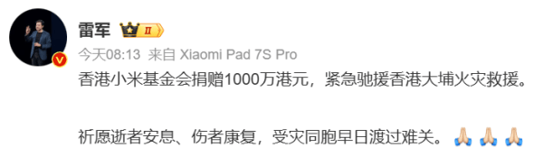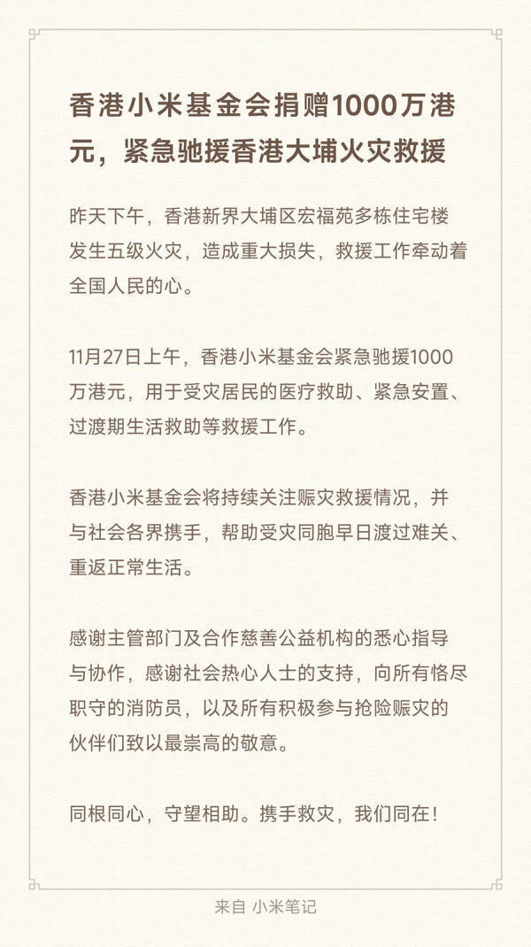 为助力受灾同胞渡过难关,香港小米基金会于今日上午宣布,紧急捐赠1000万港元用于赈灾救援。这笔资金将专项用于受灾居民的医疗救助、紧急安置及过渡期生活保障,确保受灾群众的基本生活需求得到及时满足。