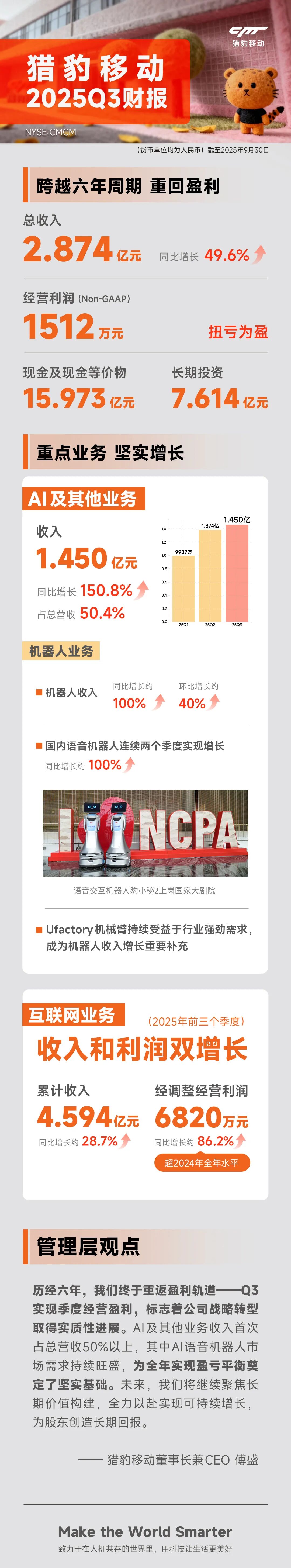 公司管理层在财报中强调,经过六年战略调整,猎豹移动已重回盈利轨道。董事长傅盛指出,AI语音机器人市场需求持续释放,不仅推动业务占比突破五成,更为全年经营目标达成奠定基础。当前公司正加速构建"AI+硬件+服务"的生态体系,通过垂直场景的深度渗透,持续巩固在智能服务机器人领域的领先地位。