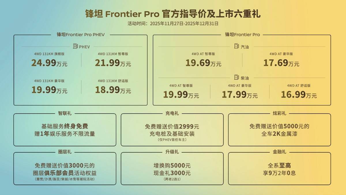 日产锋坦Frontier Pro凭借汽油、柴油、插混三种动力系统,覆盖了用户的全场景需求。其配置大幅提升,完善了传统皮卡所欠缺的舒适和科技配置。14.99 - 24.99万的售价区间,使其性价比优势凸显,在这个价位段,鲜有车型能同时满足“三种动力全覆盖、硬核性能不缩水、舒适科技全拉满”的要求。