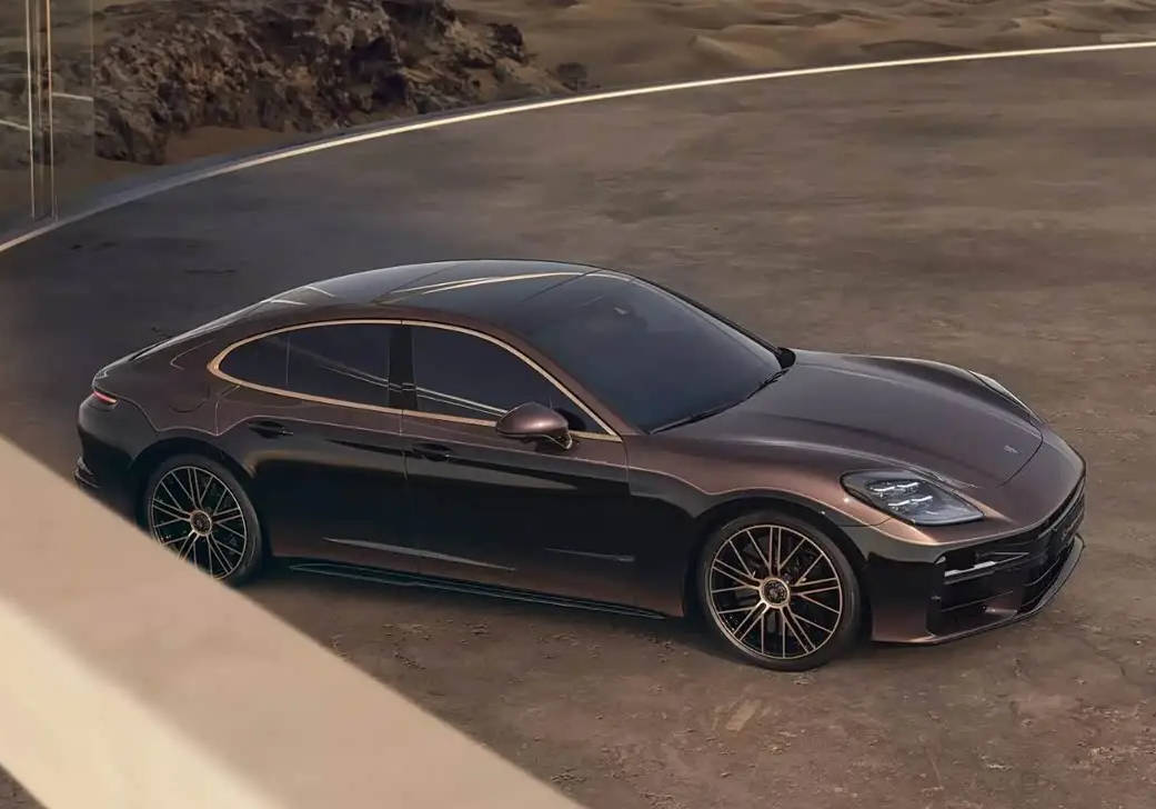 外观方面,这款定制版Panamera Turbo采用了独特的双色车身设计,上半部分为日落红色金属漆,下半部分则为布朗紫色金属漆,两种颜色在车身中部自然过渡,形成强烈的视觉冲击。为了进一步提升整车的奢华感,保时捷还在漆面中添加了金粉作为装饰,使得车辆在阳光下能够散发出璀璨的光芒。车身四周的装饰条以及21英寸轮圈均采用了金属色处理,与车身颜色相得益彰。