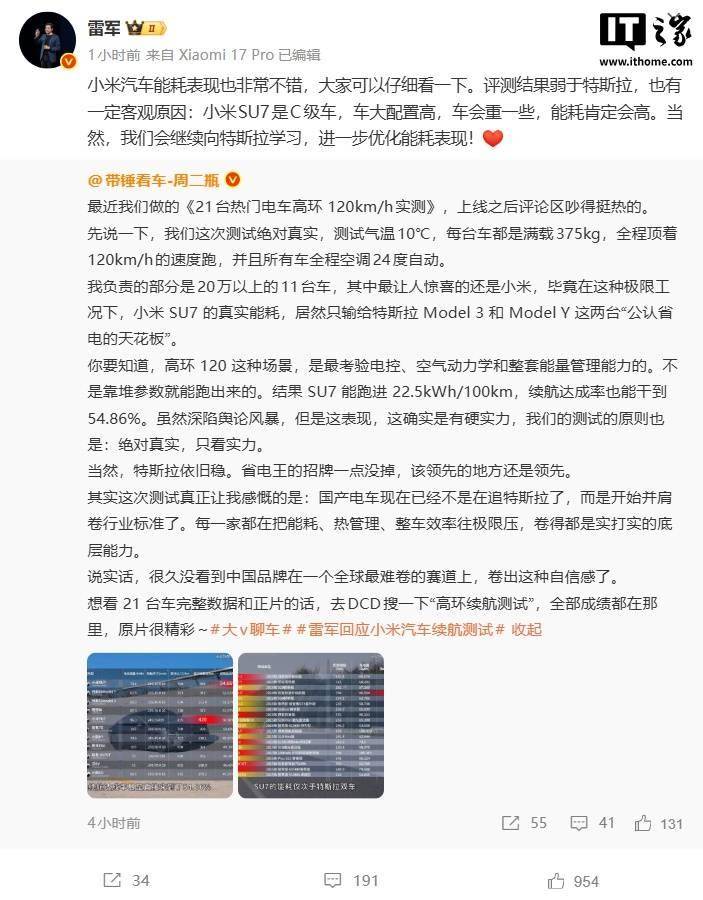 针对近期外界关注的能耗评测话题,雷军通过社交平台回应称,小米SU7作为C级轿车,因车身尺寸较大且配置丰富导致整备质量偏高,能耗表现略逊于特斯拉属于客观差异。他同时强调,小米汽车团队将持续优化技术路径,向行业标杆学习提升能效水平。这一表态既承认了当前差距,也传递出技术攻坚的决心。