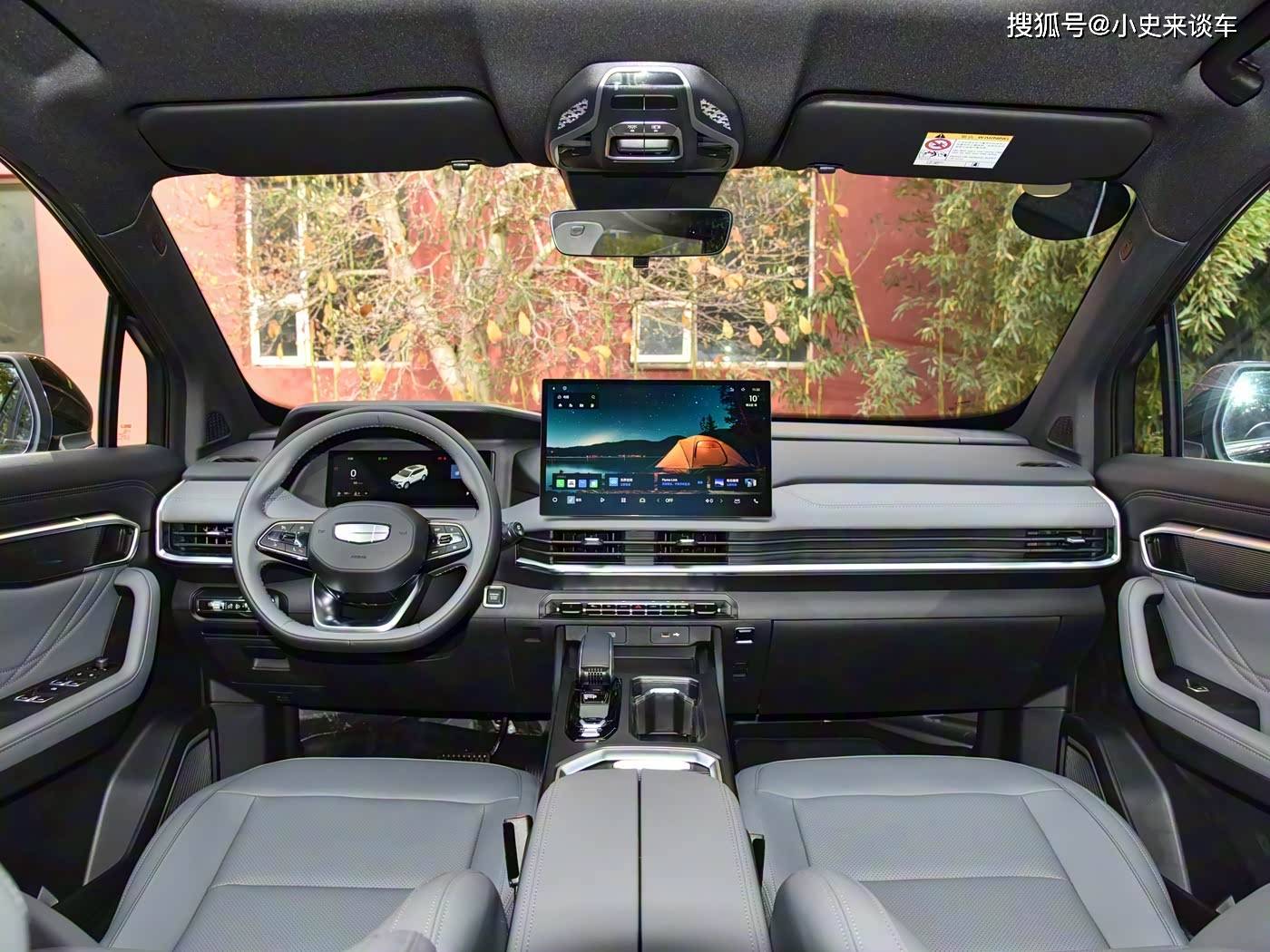 进入车内,豪越L以“云端全景”为设计理念。60英寸四季流转全景天窗搭配高坐姿设计,白天采光充足,夜晚可陪孩子观星。内饰提供暖阳棕与月影灰两种配色,灵感分别来自桂林日落与祁连月色。接触面大面积采用软质搪塑包裹,缝线工艺工整,不过门板下方硬塑料材质稍显不足。智能化方面,车辆配备10.2英寸仪表和14.6英寸中控屏,搭载银河OS 2.0系统,支持HUAWEI HiCar互联与三指飞屏。第二排座椅支持前后调节和靠背角度调节,乘客可按需调整到最舒适坐姿。第三排座椅空间也较为宽敞,成年人乘坐也不会感到过于拥挤。