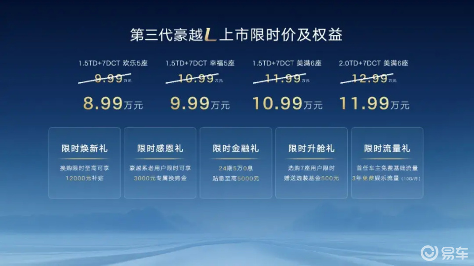 第三代豪越L不仅在价格上诚意满满,还为消费者准备了多重丰厚购车权益。限时焕新礼中,换购用户最高可享12000元补贴;豪越系老用户换购还能额外获得3000元限时感恩礼。限时金融礼方面,提供24期5万0息的贴心服务,贴息最高可达5000元。还有限时流量礼,首任车主可享受基础流量免费,以及3年免费娱乐流量(每月10G),让用户以极具性价比的方式拥有B级大空间SUV,开启B级SUV大空间平权的新时代。