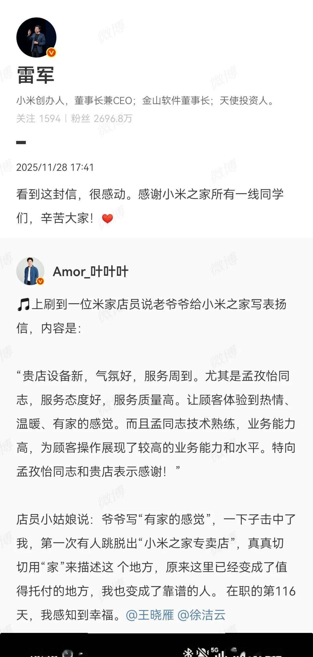 这封充满温度的信件很快被小米集团董事长雷军转发至个人微博。雷军表示,一线员工的真诚付出是品牌最珍贵的财富,正是这些看似平凡的细节,构筑起用户对品牌的信任。数据显示,截至2025年9月,小米之家全国门店总数已突破1.8万家,其中500平方米以上的大型体验店达210家,海外门店数量同步增长至300家,形成覆盖城乡的立体化服务网络。