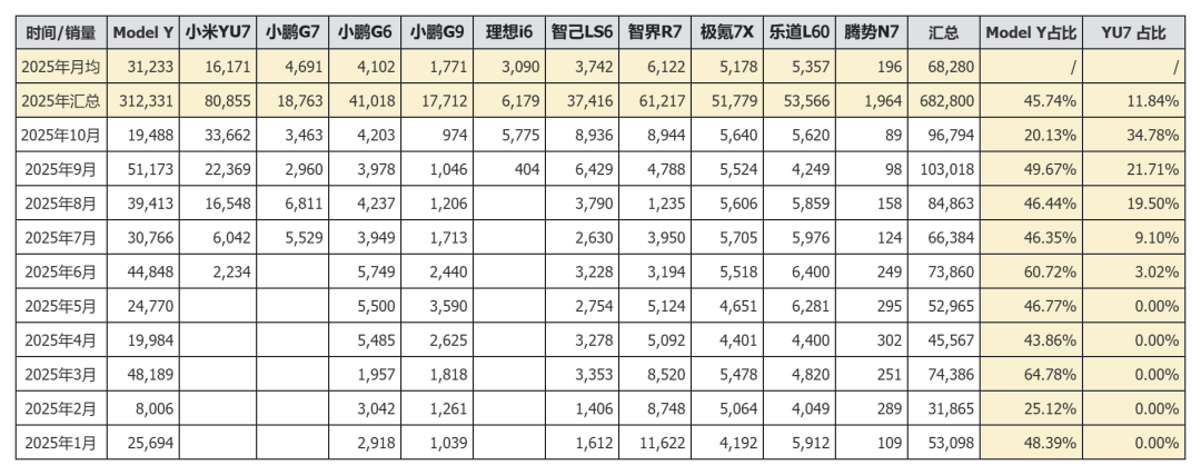 在细分市场层面,15-30万元纯电SUV领域呈现明显分层:15万元级主打性价比,如比亚迪海狮06;20万元级聚集了极氪7X、乐道L60等“守门员”产品;25万元级则由Model Y长期占据主导地位。小米YU7精准切入这一区间,通过“更大空间、更高配置、相近价格”的策略直接挑战Model Y。数据显示,YU7上市后迅速抢占该细分市场近三分之一份额,且份额呈持续扩大趋势,对Model Y形成实质性冲击。