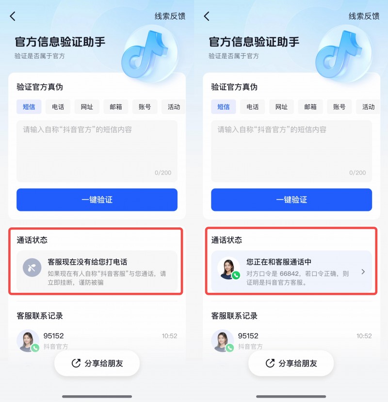 近两年来,仿冒“抖音客服”诈骗的现象时有发生。诈骗分子假冒抖音官方客服身份,以“您有某项服务或会员即将扣费”为由,诱导用户下载第三方软件并共享屏幕,继而远程控制用户手机盗取用户财产。在此背景下,抖音于2024年12月正式推出官方信息验证工具“验证助手”,用户只需打开抖音搜索“验证助手”,输入可疑来电号码、短信或网址,即可明辨其是否来自抖音官方。今年4月,抖音对验证助手进行升级,推出“一键查询官方联系记录”功能,可查看抖音官方客服与自己的联系记录,并于同年5月再度升级,上线“官方动态验证口令”。