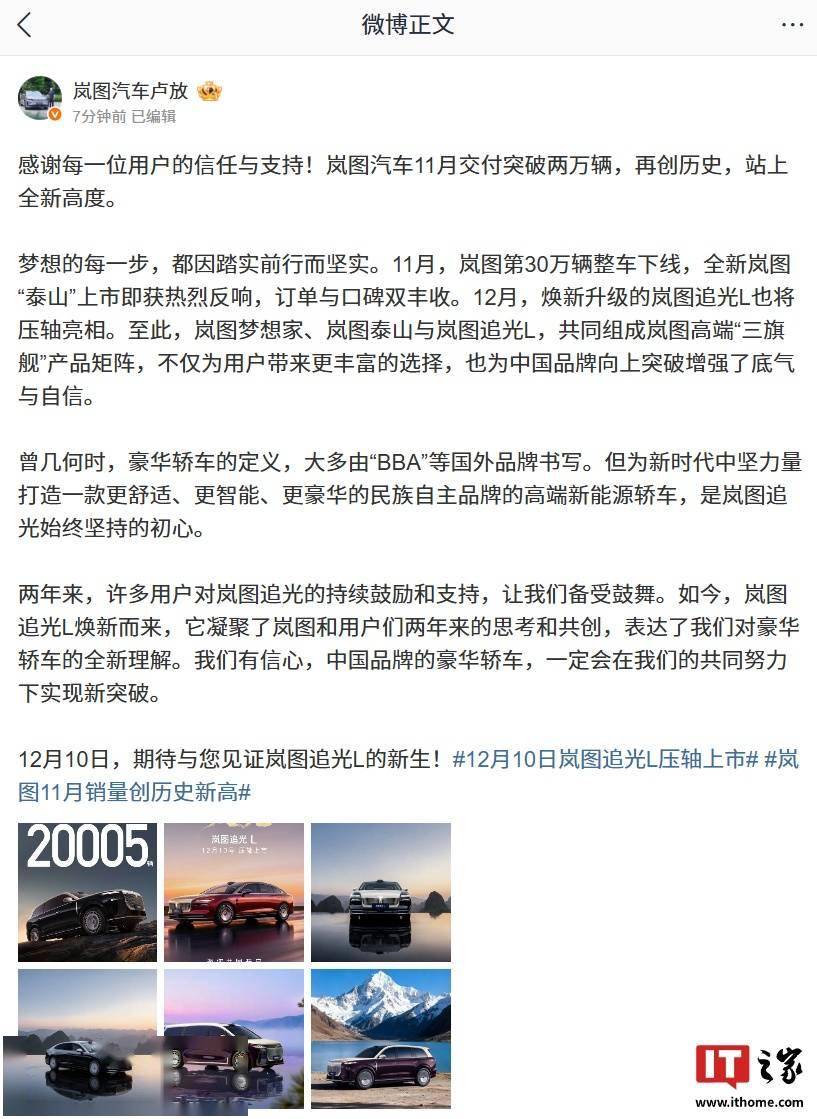 在11月18日举办的岚图泰山车型上市发布会上,品牌CBO兼销售公司总经理邵明峰透露了一项重磅计划:岚图追光L将于12月正式推向市场。这款新车被定位为豪华轿车领域的“最优解”,旨在通过技术升级与配置优化,满足消费者对高端出行的需求。其发布时机恰逢品牌交付量攀升的关键节点,进一步凸显了岚图加速布局细分市场的战略意图。