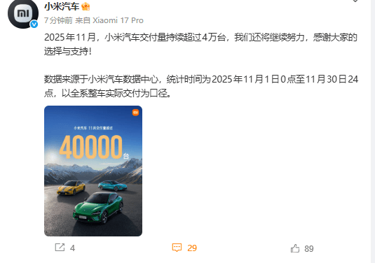 小米汽车近日公布了最新的市场表现及渠道拓展成果。数据显示,11月交付量突破4万台,这一成绩引发市场关注。公司创始人雷军通过社交平台回应称,团队将持续优化产品与服务,并感谢用户的信任与支持。