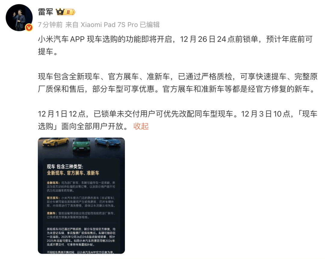 对于其他用户,现车选购服务将于12月3日10点全面开放。届时,所有用户均可通过小米汽车APP浏览现车资源,并根据自身需求进行选择。这一服务的推出,标志着小米汽车在销售模式上的进一步创新,为用户提供了更加灵活的购车方案。