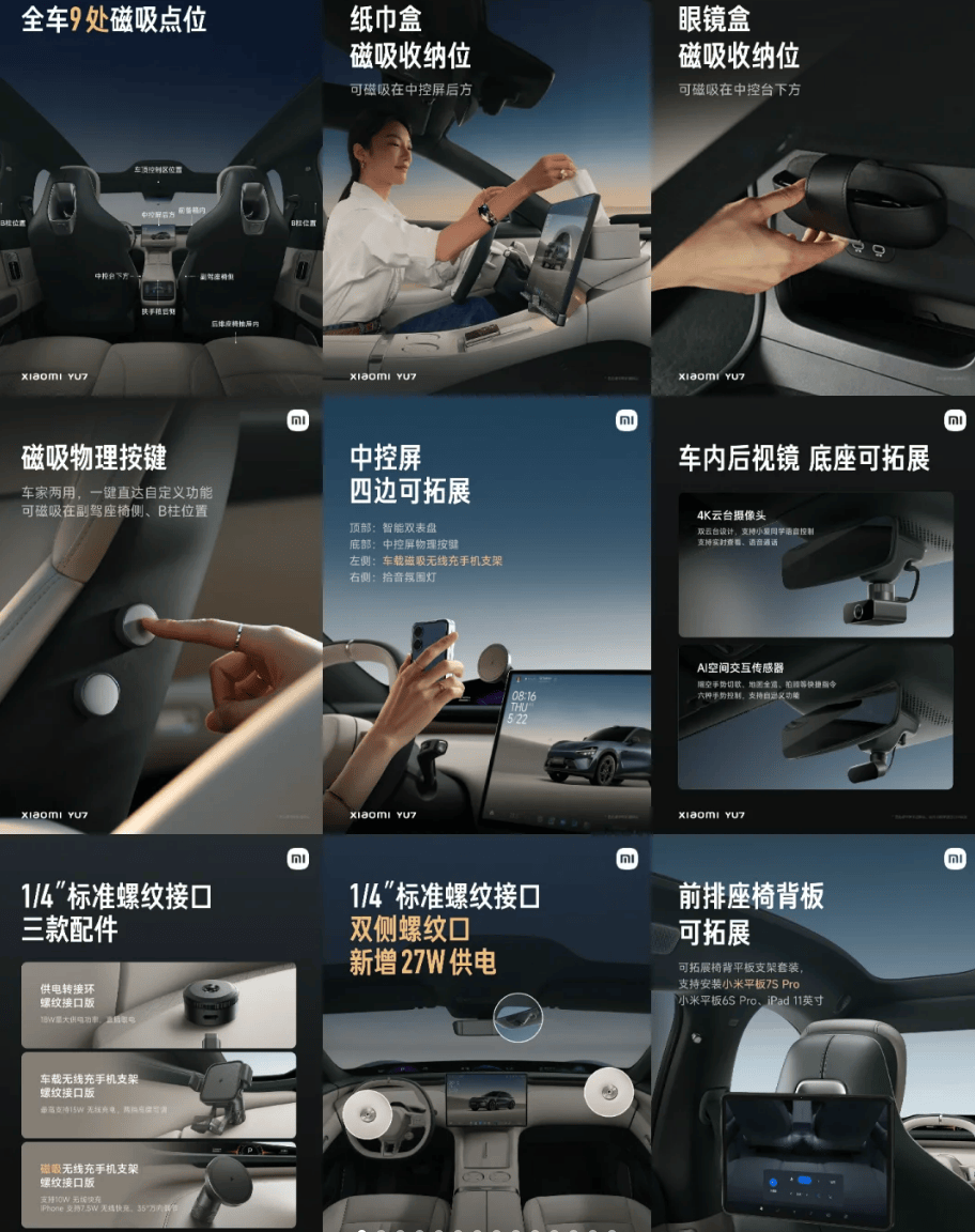家庭出行与收纳痛点的解决,更能体现产品的“生活温度”。电动车前备箱的普及,不仅拓展了储物空间,还更加方便置物和取物,拥有更大前备箱的乐道L90、蔚来ES8等车型因此备受好评。车内的储物设计同样重要,银河E5、星愿与智界R7在第二排座椅下方设置抽屉式储物盒,将空间利用做到极致,毛毯、拖鞋、纸巾等物品能被整齐收纳。小米YU7的中控扶手箱设计也堪称巧思,下方超大开放式储物空间,既能放下女士的背包,也能轻松容纳一双高/平底跟鞋,还可搭配可拆分的置物架实现分区收纳,精准击中了用户的收纳焦虑。