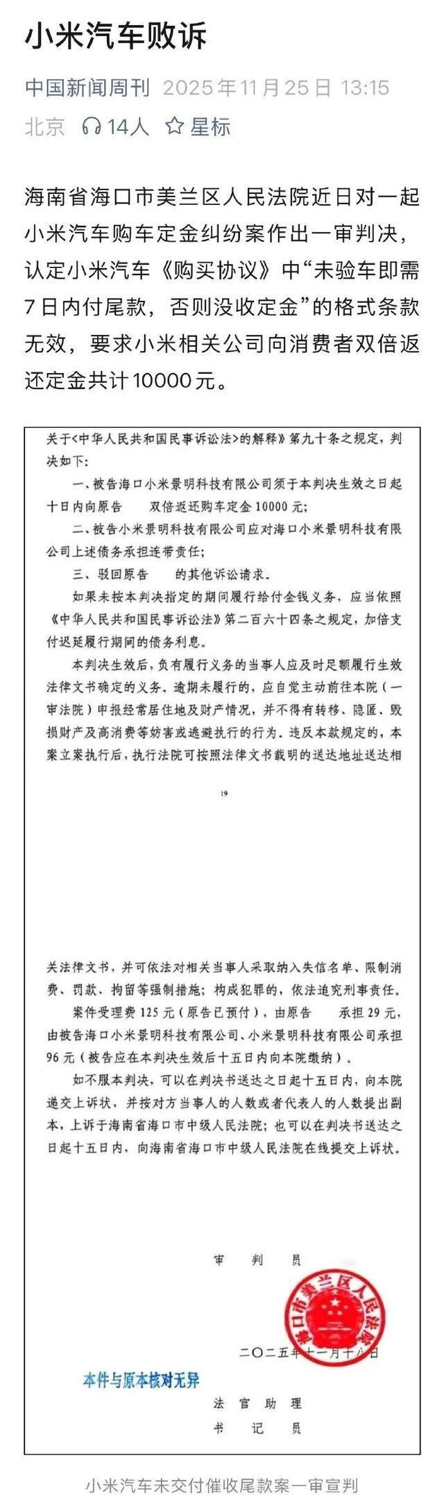 雷军在社交媒体公布成绩后,评论区迅速分化为两大阵营。支持者强调"数据不会说谎",质疑者则翻出旧账:今年5月推出的4.2万元碳纤维机盖选装件,被曝存在宣传与实际不符的问题。车主发现该配件不仅未带来承诺的散热性能提升,反而导致前备箱取消,而小米法务团队"雷军言论不代表技术事实"的回应,更被解读为对品牌创始人的公开背弃。这场风波尚未平息,全国首例定金纠纷案的司法判决又添新伤——法院认定小米单方面修改付款条款的行为违反《消费者权益保护法》,相关格式条款被判无效。