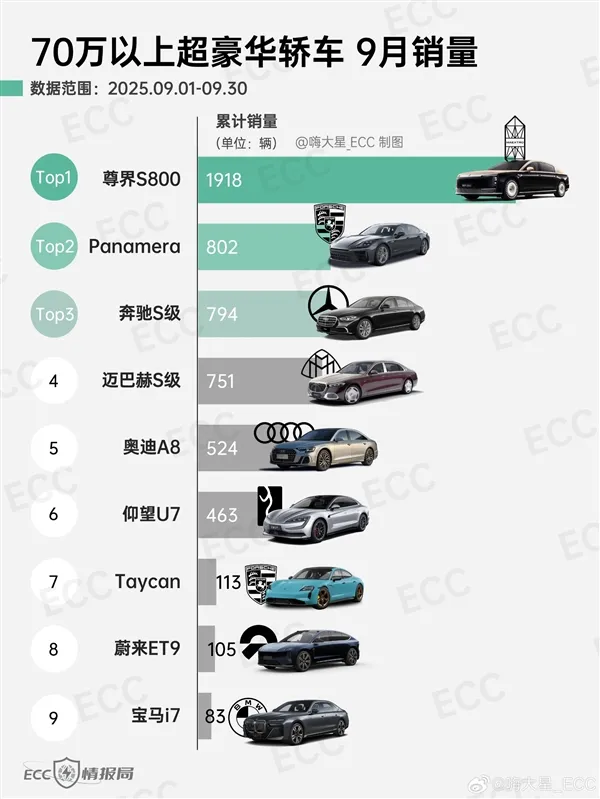 根据多家科技和汽车博主的销量统计,在9月份,尊界S800卖了接近2000辆车,这个成绩让它在这个顶级细分市场里排到了第一。