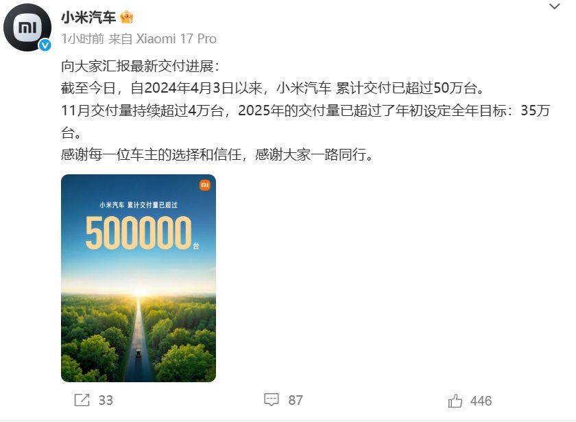 小米汽车近日公布了最新交付数据及销售新举措。自2024年4月启动交付以来,截至12月2日,该品牌累计交付量已突破50万台,其中11月单月交付量连续第二个月超过4万台。值得关注的是,2025年尚未过半,其全年交付量已超越年初设定的35万台目标。