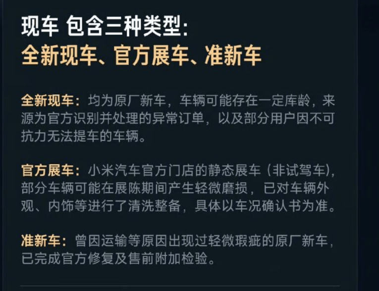 12月1日,小米汽车创始人雷军通过社交平台宣布,小米汽车APP将于近期上线现车选购功能。根据规则,用户在12月26日24点前完成锁单,可享受年底前提车服务。这一模式涵盖三类现车资源:全新现车、官方展车及准新车,所有车辆均通过严格质检流程,并提供完整原厂质保及售后服务,部分车型还推出优惠方案。