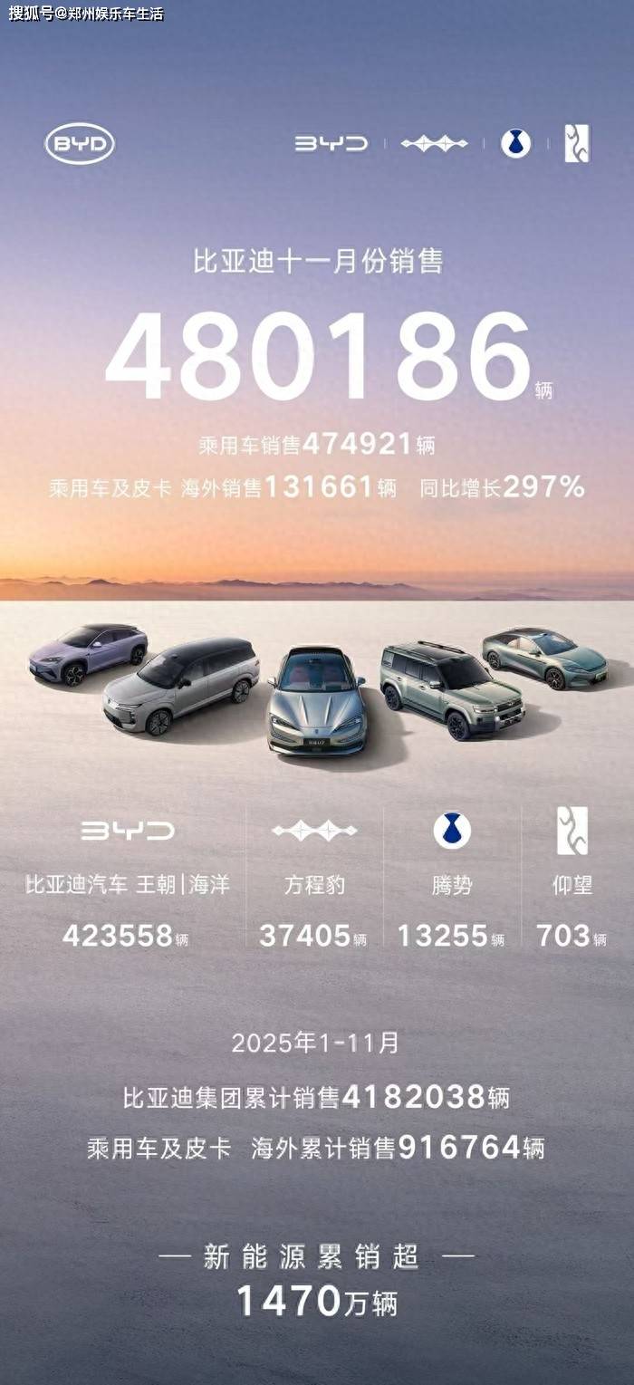 在新能源汽车领域,比亚迪再度交出了一份令人瞩目的成绩单,彰显出其作为行业领军者的强大实力。11月,比亚迪全月销售汽车480186辆,这一数字不仅刷新了年内销售纪录,更以稳健的姿态持续引领市场潮流。其中,乘用车板块表现尤为突出,贡献了474921辆的销量,成为推动整体增长的核心力量。