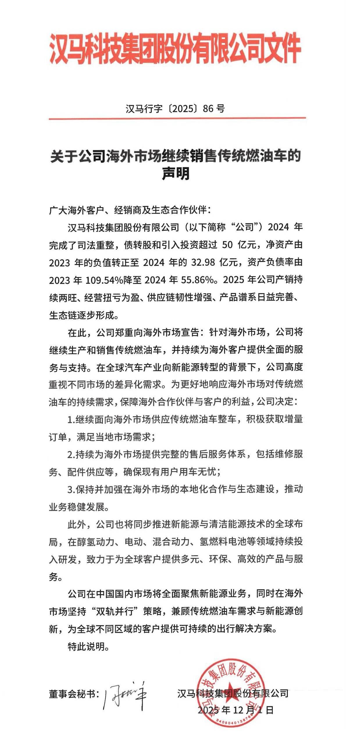 公开信息显示,汉马科技此前已明确新能源转型方向。2022年6月,公司曾发布公告,计划于2025年12月停止传统燃油车的整车生产,全面转向纯电动、甲醇动力、混合动力及氢燃料电池等新能源与清洁能源汽车业务。这一战略调整体现了公司对绿色出行的坚定承诺。