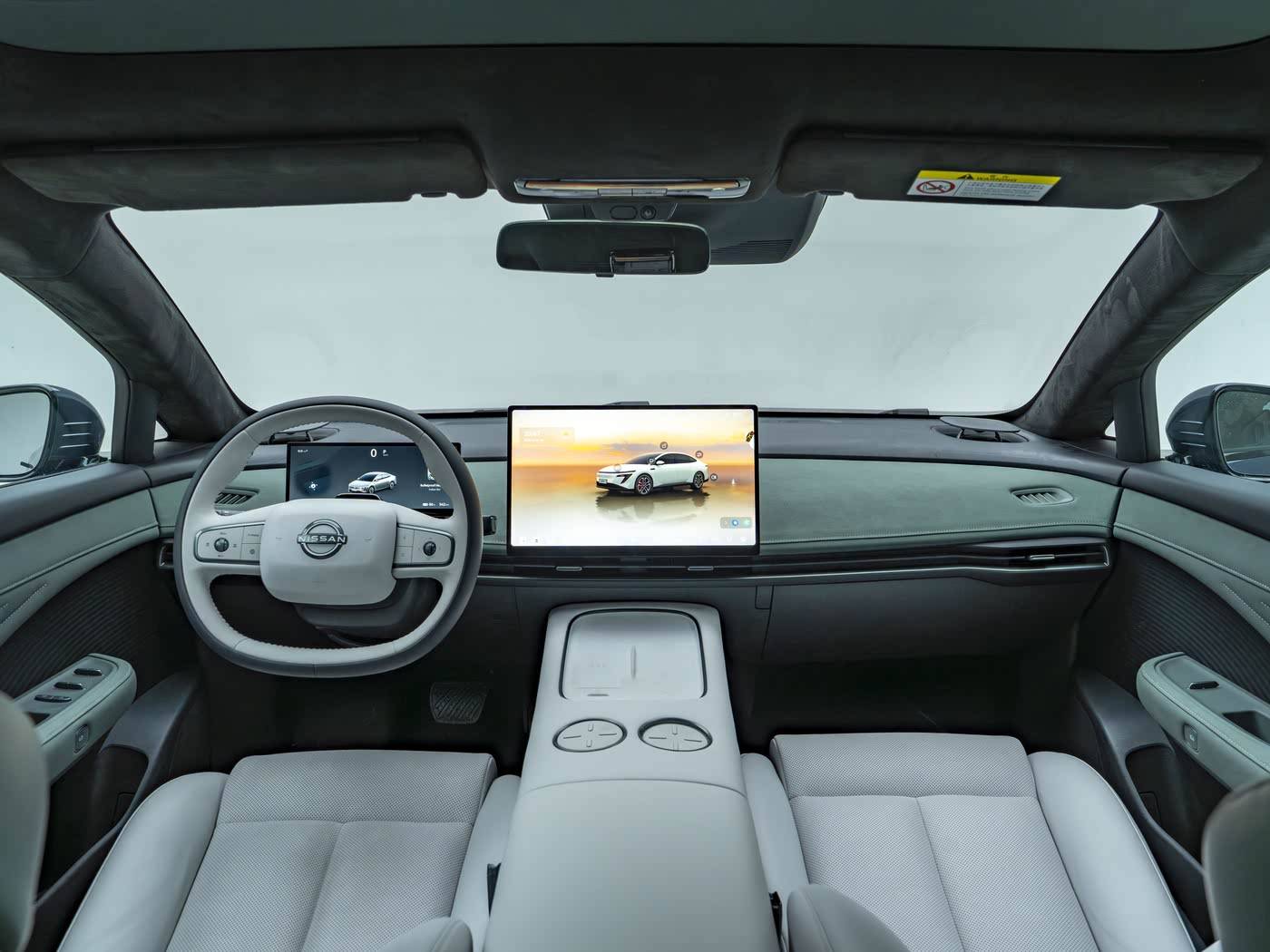 内饰布局延续日产家族化风格,但通过细节调整形成差异化特征。中控台采用横向内凹设计提升层次感,相连式杯架与N7车型的独立设计形成区分。双幅式方向盘配备简约按键布局,2.5K分辨率屏幕成为全系标配,提供14.6英寸与15.6英寸两种尺寸选择。车机系统支持苹果CarPlay、华为HiCar及CarLink三平台互联,中低配车型搭载8155芯片,顶配版本升级为8775芯片并配备256色氛围灯。内饰配色提供米白、雅黑两种免费方案。